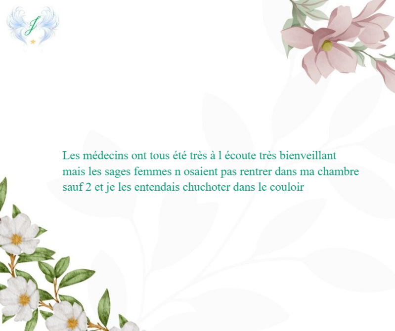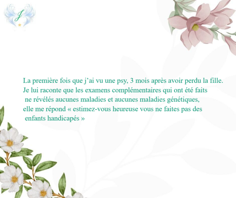 Le lendemain de mon accouchement, à 6h du matin, j'appelle une sage-femme car je me sens horriblement mal, je suis en pleine crise d'angoisse. Elle me dit : "Ah, c'est compliqué et bien vous pouvez pleurer là " me laissant seule dans le couloir devant les faire-part de naissance et un berceau. À ma tête, elle ajoute que je peux aussi aller prendre l'air dehors (on est en hiver et il fait nuit...). "Oui, ce n'est pas pareil, vous ne l'avez pas porté, ni senti et puis il faut être fort pour elle." à mon compagnon. Toujours à mon compagnon " Ah non désolé monsieur, on ne donnera des infos qu'à madame, légalement c'est la seule à pouvoir avoir des informations sur le bébé" "Mais non, vous verrez, vous irez mieux !